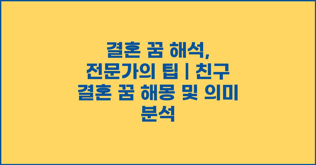 결혼 꿈 해석, 전문가의 팁 | 꿈해몽 꿈풀이 꿈해석 꿈의미는 꿈을 통해 얻는 정보로 여러분의 삶을 더욱 풍부하게 만들 수 있습니다. 꿈은 우리의 내면을 비춰주는 거울과 같으며, 이를 통해 얻은 통찰은 미래의 방향성을 다잡는 데 유용하므로, 자신의 꿈을 소중히 여기고 해석하는 데 시간을 투자해 보시길 권합니다.