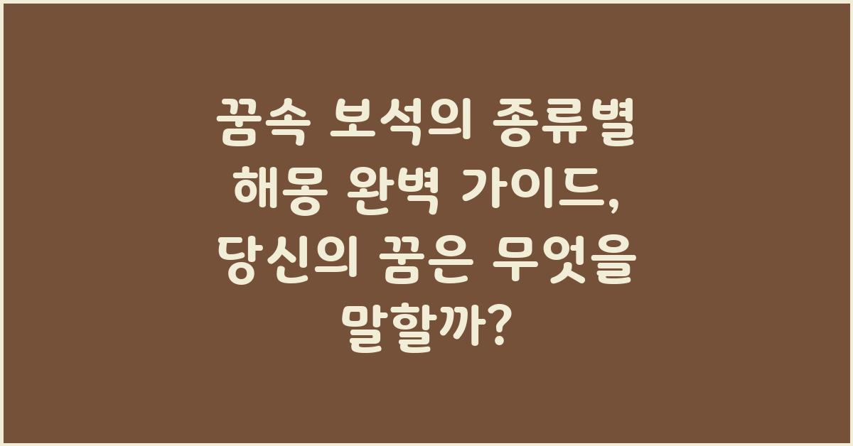 꿈속 보석의 종류별 해몽 완벽 가이드 | 꿈해몽 꿈풀이 꿈해석 꿈의미는 여러분의 삶에 큰 변화를 가져올 수 있는 중요한 도구입니다. 꿈에서 접하는 보석은 여러분의 내면과 외부 세계를 비추는 거울입니다. 삶의 메시지를 찾고, 이를 통해 성장할 수 있는 기회를 놓치지 마세요.