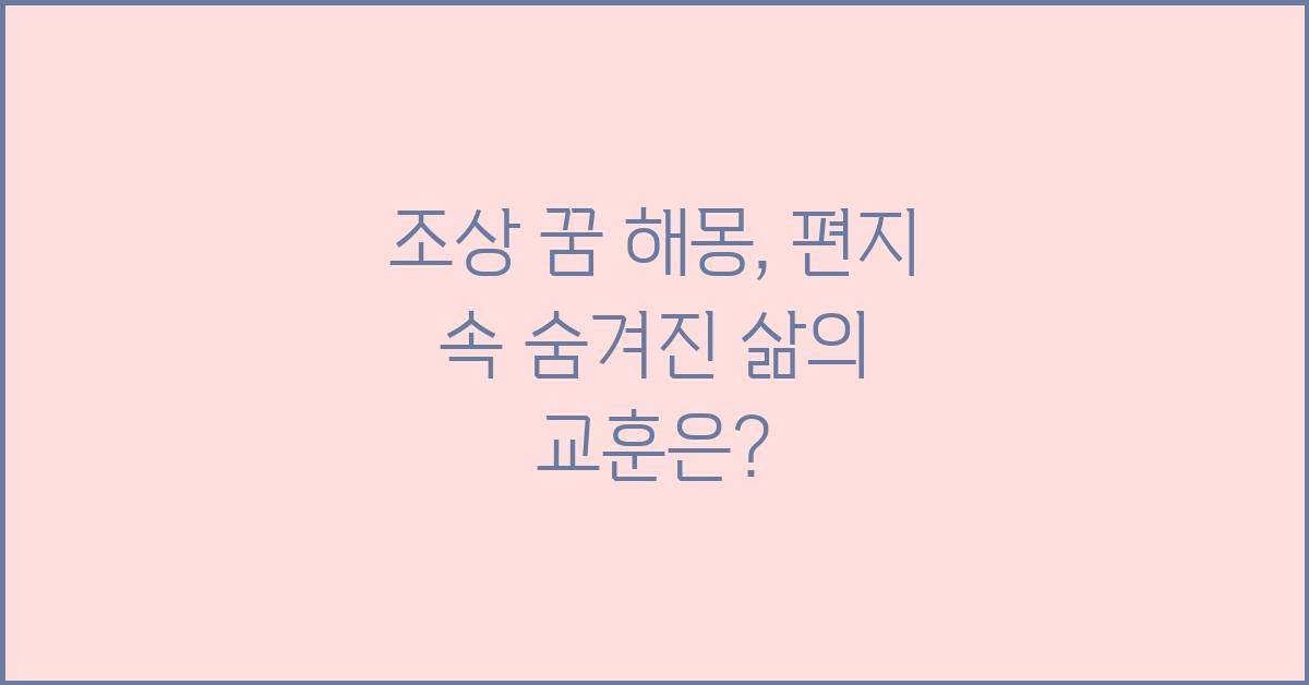 꿈 속의 편지는 그 자체로 중요한 메시지를 담고 있으며, 간혹 우리가 잊고 있었던 소중한 가치를 일깨워 줍니다. 예를 들어, "일은 게을리 하지 마라" 라는 교훈이 있다면 이는 성공을 이루기 위해서는 끈기와 성실이 필요하다는 의미입니다. 조상 꿈 해몽: 편지 내용과 삶의 조언 | 꿈해몽 꿈풀이 꿈해석 꿈의미 속에 이런 귀중한 메시지가 숨어 있죠.
