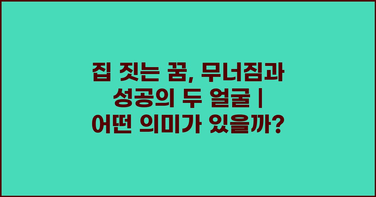 집 짓는 꿈, 무너짐과 성공의 두 얼굴 | 꿈해몽 꿈풀이 꿈해석 꿈의미는 결국 우리의 인생 여정에서 중요한 메시지를 전달합니다. 이 꿈을 통해 자신을 성찰하고 변화의 기회를 찾으며, 실질적인 목표를 세울 필요가 있습니다. 우리가 흔히 겪는 두려움과 불안이 오히려 더 나은 삶을 위한 계기가 될 수 있음을 기억해야 합니다. 이를 통해 우리는 꿈에서 얻은 교훈을 현실로 가져오고, 더 나은 방향으로 나아갈 수 있습니다.