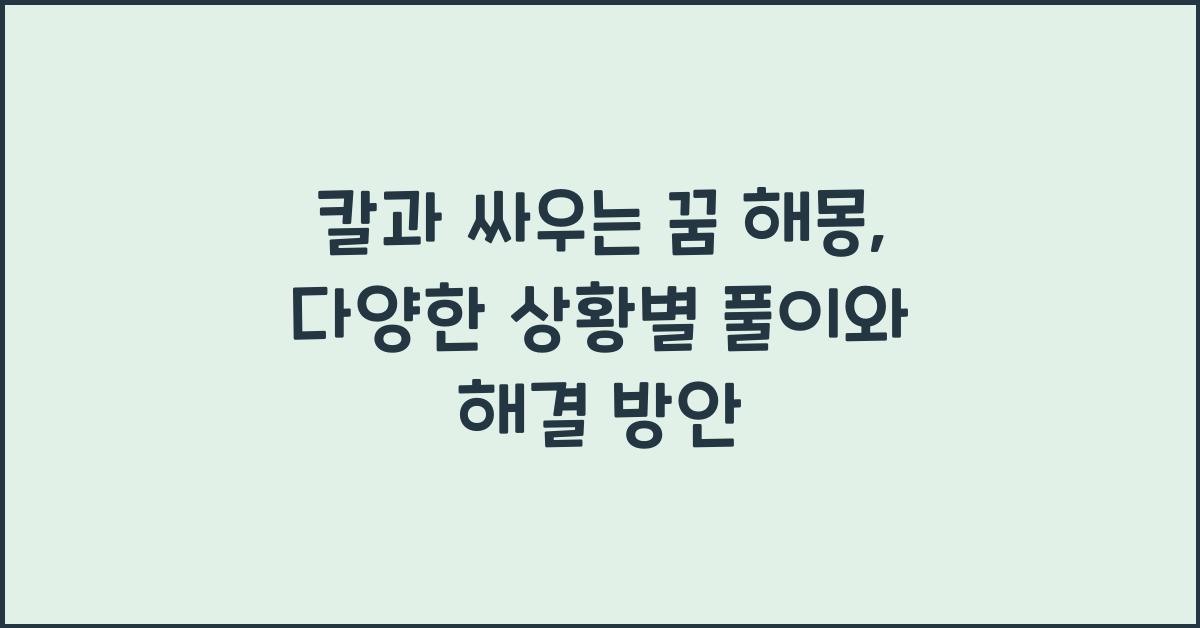 칼과 싸우는 꿈을 꿨을 때, 당신은 불안, 스트레스 또는 갈등과 같은 감정을 경험하고 있을 가능성이 큽니다. 이러한 꿈을 해몽할 때는 자신의 현재 상태와 상황을 잘 살펴보는 것이 중요합니다. 각 개인이 겪는 상황과 감정은 서로 다르기 때문에, 같은 꿈이라도 그 의미는 전혀 달라질 수 있습니다.